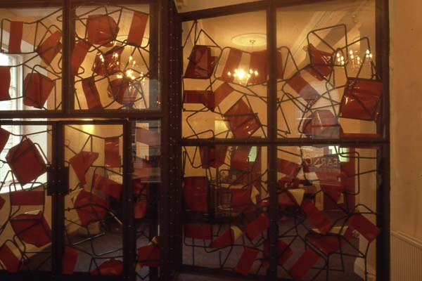 'Chair Wall' A 6.5 metre wide glass partition wall sandwiching 45 powder coated squashed steel chairs. Yorkshire Arts, Dewsbury 1994