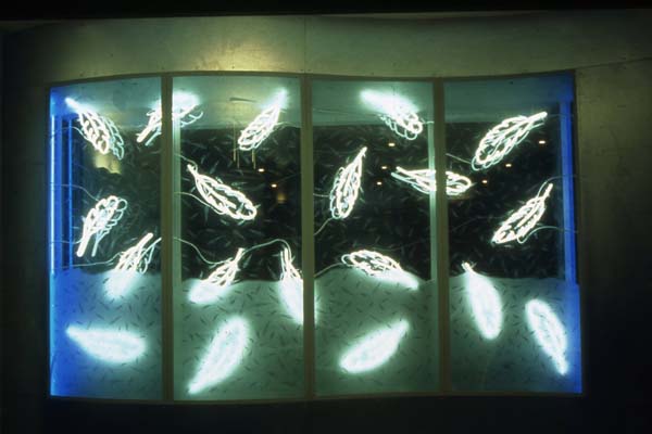 'Featherlight' A serpentine sandblasted glass partition wall in the Yorkshire Dance Centre in Leeds. With Neon 'Feathers' 1994