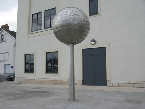 'Name Bush' Situated in Dock Street, Newport. 1.6m diameter stainless steel sphere with the surnames of all the streets residents over the past 100 years.
