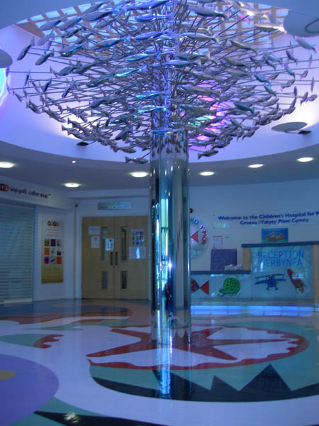 'The Fish Tree' 340 polished stainless steel hydroformed fish with jellyfish neon illumination. 'Coral Pool' vinyl floor design situtated in Cardiff Childrens's Hospital. 2004