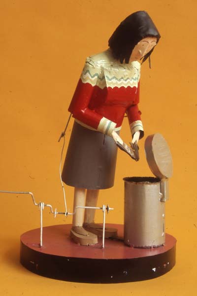 'Monday Morning'. A small Tinplate Automata constructed of painted Tinplate. A deeply worn lady scrapes the burnt bits off the toast into the bin. 2002