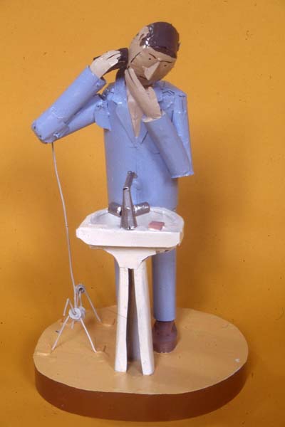 'The Joy of Shaving'. A small painted Tinplate Automata. A thin meek man pointlessly pushes a foil shaver across his chin. 2001