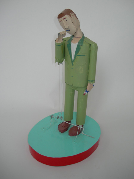 'Toothbrushing'. A simple painted tinplate automata of a thin dull man polishing his choppers. 2004.