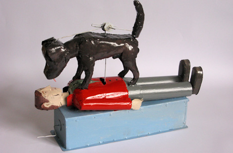'Tippoos Dog'. A painted soldered tinplate with simple wire crank mechanism. Inspired by 'Tippoos Tiger' in the V & A.