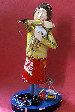 'Burping' A small tinplate automata of a lady attempting to remove the built up gases in a small one. 280mm high.