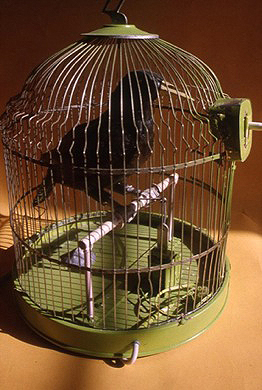 'The Quiet Bird' A tinplate jackdaw in a cage, activated violently by a soldenoid. 510mm high.