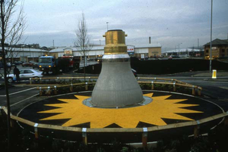 'Fallen Star', Foster Square, Bradford. A 3.2 metre high bead blasted stainless steel light bulb, with a brass cap, neon illumination and yellow EPDM surfacing. Copyright Andy Hazell 2010