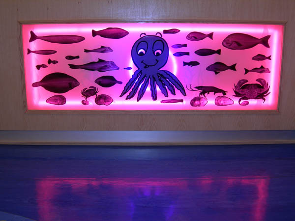 'The Radiology Department Desk' Xrays of fish on vinyl, backlit with neon.