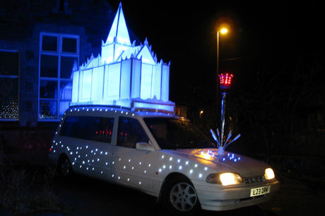 'The Temple of Plastic Excess' A white hearse with 4.4m high acrylic cathedral illuminated by 4100 L.E.Ds. Built for Newcastle New Year Celebrations.