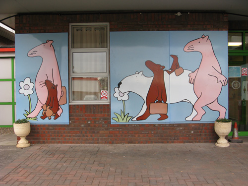 'The Helpful Animals' Screen printed enamelled panels for stoke paediatric hospital, 2.4m high.