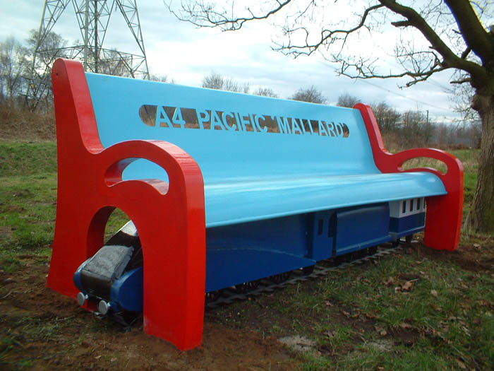 'Train Seat' on Doncaster Greenway, constructed of painted galvanised steel, 2.4m long.