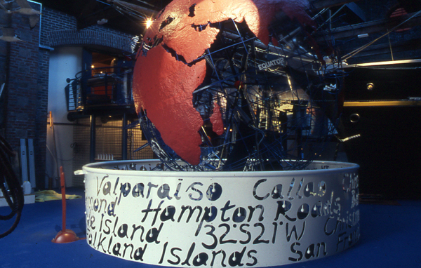 'The Voyage Globe' A 3.4m diameter steel globe orbited by 4 small, pnematically driven sailing ships. Jersey Maritime Museum.