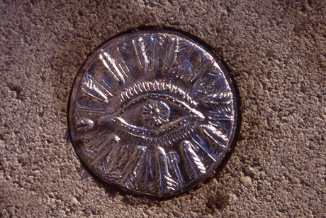 'Pavement Plaques' One of 100 different bronze discs 150mm diameter set into the pavement in Maesteg town centre. Created by teenagers at a drop in centre.