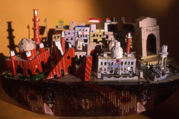 Delhi ← Previous Next → ‘Delhi’ A 40cm wide panorama of the city made from soldered recycled tinplate. 2002