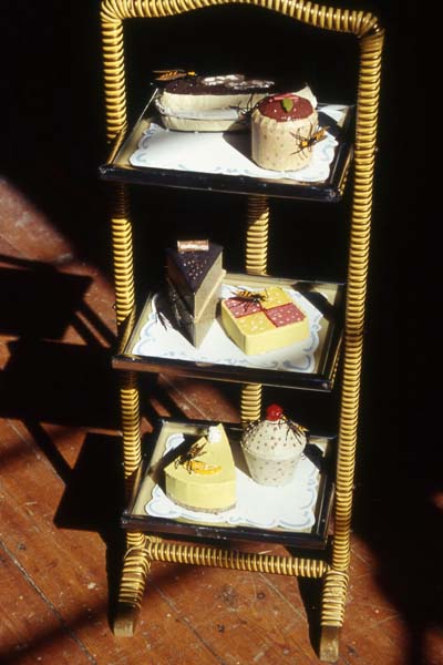 'A perfect moment spoiled'. A 1930's bamboo cake stand with painted Tinplate 'cakes' covered in oversize tinplate 'wasps'. 2002