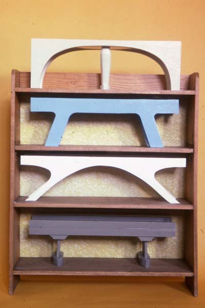'My Favourite Motorway Bridges'. A cheap wooden shelving unit with painted plywood models of Bridges, the M1; M4, M5 and M62. 2002