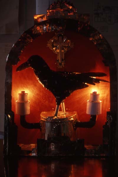 'Crow Shrine'. A life size painted tin plate crow atop a telegraph pole. 1991.