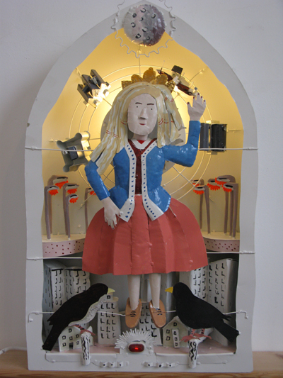 'Alice in the City'. Constructed of painted tinplate with lamp.