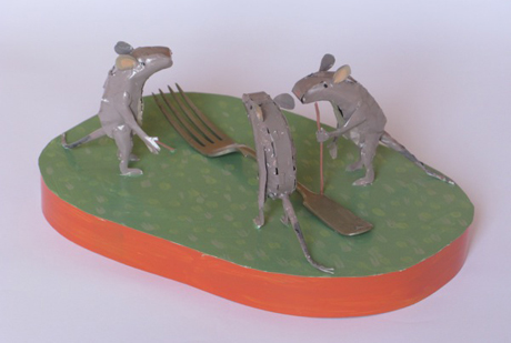 Voles discover another civilisation. Painted tinplate with a kitchen fork. 240mm wide. Copyright Andy Hazell 2010