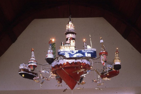 'Lightships and Buoys' Three tinplate ships and six buoys surround a lighthouse illuminated by 12 volt lamps.
