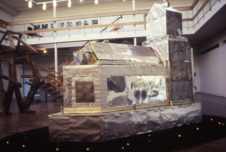 'Sarcophagus' Constructed of beated castrol cans and plywood. 2.4m high.